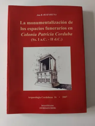 Título: La monumentalización de los espacios funerarios en Colonia Patricia Corduba (Ss. I a.C. – II d.C.) Autora: Ana B. Ruiz Osuna Editorial: Servicio de Publicaciones de la Universidad de Córdoba Colección: Arqueología Cordobesa, nº 16 Año: 2007 ISBN: 978-84-7801-878-9 📖 Descripción: Monografía especializada sobre la arquitectura y monumentalización de los espacios funerarios en la Córdoba romana. Obra de referencia para estudios de arqueología, historia antigua y patrimonio romano, con análisis detallado, bibliografía académica y material gráfico. 📌 Estado: Muy buen estado general. Cubierta y páginas limpias, sin subrayados