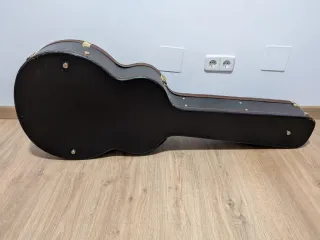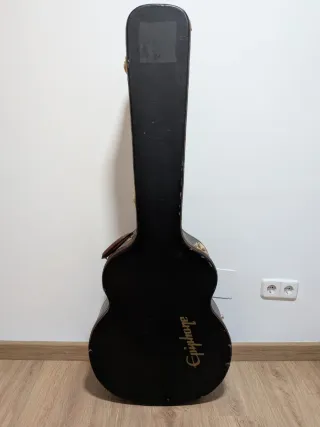 Estuche vintage para bajo acústico de la marca Epiphone. Estructura de madera solida. Acabados en cuero y polipiel. Interior acolchado de terciopelo verde oscuro. Herrajes dorados. Compartimento para accesorios. Muestra señales de uso por el paso del tiempo pero nada que afecte a su funcionalidad y estética. - Medidas: 128x49x17 cm. - Color negro. - Logo Epiphone en dorado.