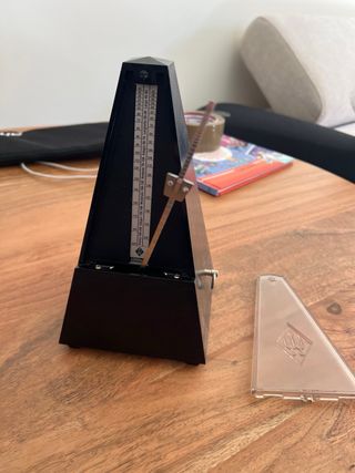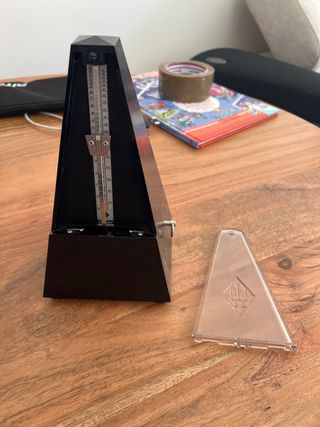 Metrónomo Wittner de color negro. Incluye la tapa protectora transparente. - Diseño triangular clásico. - Escala de tempo visible.