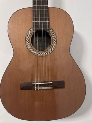 Guitarra clásica de escala corta Guitarra ideal para jóvenes o personas con manos pequeñas. También perfecta como guitarra de viaje o para tocar cómodamente en el sofá 😉 La compré hace un año directamente en fábrica (Bulgaria), así que no ha estado en tienda ni la ha probado nadie más. Está como nueva, muy cómoda de tocar y con un sonido sorprendentemente lleno para su tamaño. Muy fácil de tocar y con una respuesta muy agradable. Incluye funda. Especificaciones: • Tapa maciza de cedro rojo americano • Aros y fondo de sapele • Acabado a poro abierto • Puente de palosanto de la India • Filetes y roseta de madera