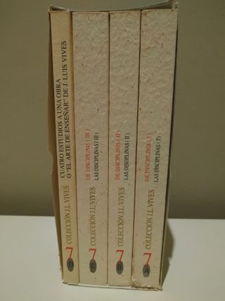 Colección de 4 tomos que recogen los escritos de Juan Luis Vives: * Las disciplinas (De Disciplinis) en tres tomos * Cuatro estudios a una obra o El arte de enseñar, en un tomo Traducidos al castellano moderno. Los tomos están en perfecto estado. La carcasa del estuche tocada y desgastada. El precio está ajustado pero es negociable. Edición a cargo del Ayuntamiento de Valencia, 1997