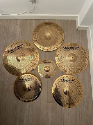 Juego completo de 7 platillos con reducción de sonido: - Hi-Hat de 14" - Crash de 16" - Crash de 18" - Ride de 20" - Splash de 10" - China de 18" Gama Millenium Still Series - 80% más silenciosos en comparación con los platos de batería estándar - Ideales para practicar en casa sin molestar a tus vecinos - Material: Níquel También vendo sueltos un ride y un hi-hat de la misma gama