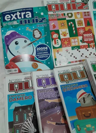Lote de revistas Quiz, la revista de pasatiempos más vendida. - Incluye números variados como el Extra N°455, N°2566, N°2551, N°2558, N°2540, N°2567. - Temáticas diversas: concursos, crucigramas, encuestas y más. - Algunas revistas incluyen suplementos de premios. Pasatiempos variados a 1 euro unidad Disponibilidad varias unidades de cada ejemplar