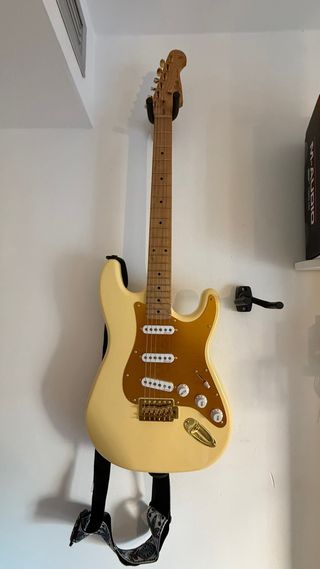 Guitarra eléctrica Harley Benton de la serie Deluxe. Un instrumento con un diseño clásico y elegante. - Cuerpo de color crema. - Golpeador dorado. - Mástil de arce. - Pastillas de bobina simple.