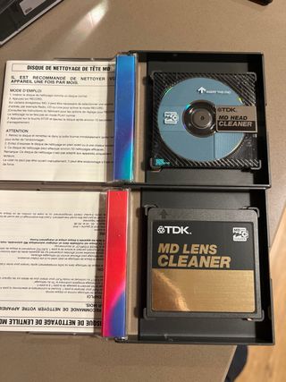 Pack de dos limpiadores TDK para MiniDisc: uno para la lente y otro para el cabezal. - Limpiador de lente MD. - Limpiador de cabezal MD. - Incluye cepillo de limpieza y hoja de limpieza especial.