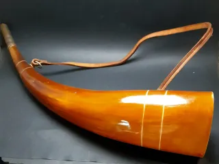 - Cuerno de caza con corneta - Incluye una correa de cuero para su transporte. - Diseño curvo y alargado.