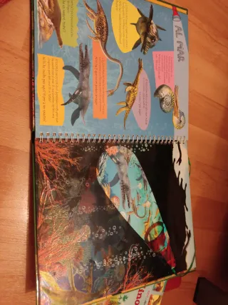 Llibre de dinos per buscar amb llanterna darrera de una plàstic fosc, molt divertit. Llibre mini Larousse molt didàctic ben explicat per nens i un altre en castellà molt complet