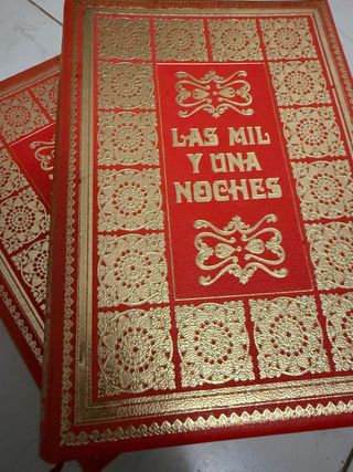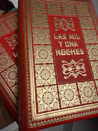 Edición de lujo de Las Mil y Una Noches con una cubierta roja y detalles dorados.(1964) - Diseño ornamental en relieve. - Título Las Mil y Una Noches en letras doradas.