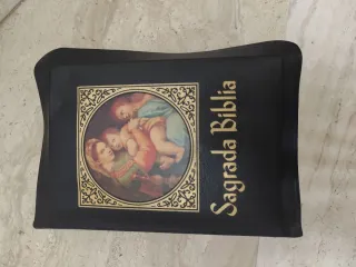 Preciosa Sagrada Biblia en su Edición Familiar Católica. Encuadernación de lujo en color negro con elegantes relieves y grabados dorados. Los cantos de las páginas están acabados en oro, lo que le da un aspecto solemne y cuidado. Incluye láminas ilustradas a color y una dedicatoria/imagen de Juan Pablo II. Ideal para coleccionistas o como biblia de cabecera familiar. En muy buen estado de conservación, sin hojas sueltas ni manchas.