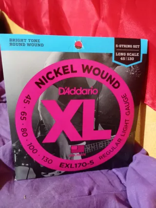 Juego de cuerdas para bajo eléctrico D'Addario XL Nickel Wound. - Set de 5 cuerdas. - Calibre: 45-130. - Longitud: Long Scale. - Acabado: Round Wound. - Tono: Bright Tone.