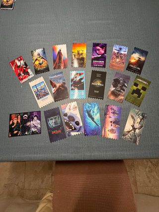 Lote de 20 miniposters de cine de varias películas. - Incluye entradas de Mufasa, Kaiju 8, Chainsaw Man, Ballerina, Dragon, Jurassic World, Badlands, Wicked, Five Nights at Freddy's 2, Jujutsu Kaisen, Captain America, Lilo & Stitch, y otras. - Diseño con borde dentado.
