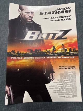 Póster promocional de la película Blitz protagonizada por Jason Statham. - Incluye los nombres del reparto principal: Paddy Considine y Aidan Gillen. - Presenta el lema Policía asesino contra asesino de policías. - Indica la fecha de estreno en cines: 23 de junio.
