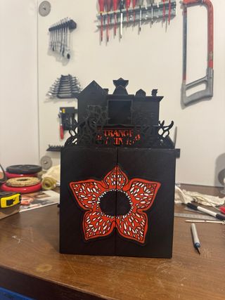 Expositor temático de Stranger Things, ideal para coleccionistas. - Diseño inspirado en la serie. - Estructura negra con detalles en rojo. - Múltiples compartimentos para figuras. - Figuras no incluidas, provenientes de los Kinder Joy - Realizado con impresora 3d