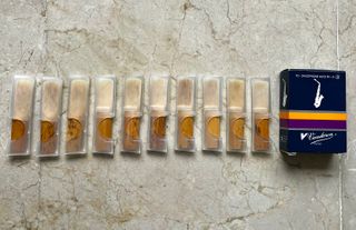 Lote de cañas (10 unidades) para saxofón alto Vandoren del no 3. Son el modelo de caja antiguo, el anterior a las actuales, las he tenido guardadas durante años, desde que pasé a cañas de plástico. Estan sin usar. PVP en tienda 32€