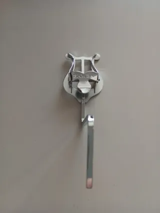 Atril metálico plateado con diseño de lira, ideal para saxo tenor. Cuenta con el nombre 'SAMBA' grabado. - Material: Metal - Color: Plateado - Diseño: Lira - Grabado: SAMBA