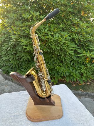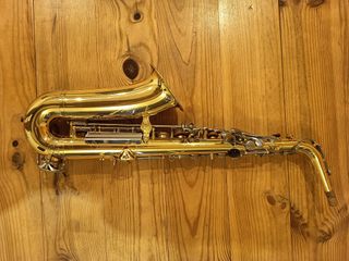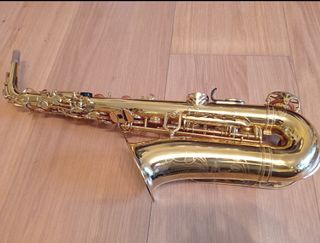 Saxofón alto Yamaha YAS-32 en excelente estado. Ajustes de llaves y cambio de zapatillas recientes. Suena de maravilla y es ideal para tocar en la calle ya que su peso es ligero. Tiene marcas de uso que no afectan a la calidad de su sonido. Incluye boquilla, abrazadera y boquillero.