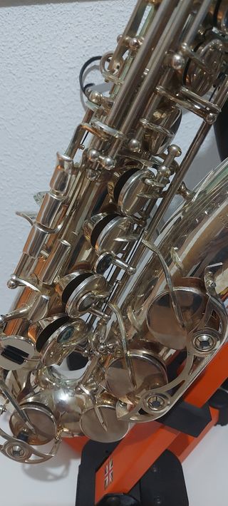 Saxo en muy buen estado. Se ha usado en casa. Acepto cambio por un saxo vintage. Suena muy bonito y las zapatillas están en muy buen estado. Se incluye estuche.
