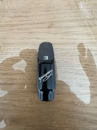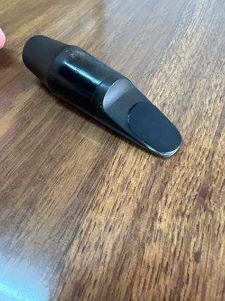 Boquilla para saxo tenor Drake NYJT, abertura 8. Esta boquilla va increíble. La vendo por una urgencia económica, pero está prácticamente nueva, solo tiene una pequeña rozadura en el lomo que ni se ve ampliando la foto, provocada por una abrazadera. Viene con su caja, abrazadera, funda y boquillero originales. El sonido es tirando a oscuro, pero con mucha potencia y proyección, versátil para diferentes estilos musicales. Hay muchos vídeos en Youtube si quieres oir cómo suena. Es más estrecha que otras boquillas de pasta y por eso, le va bien cualquier abrazadera de saxo alto. Las abrazaderas normales de tenor le quedan grandes