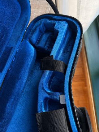 Estuche rígido para saxo alto con interior forrado en terciopelo azul. - Diseño moldeado para un ajuste seguro. - Cierres de cremallera. - Correas interiores para sujetar el instrumento.