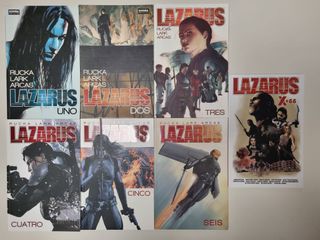 Los 7 tomos de la serie Lazarus, publicada por Norma Editorial. Incluye los volúmenes del 1 al 6 más el especial X+66. Ciencia ficción distópica con una narrativa intensa y dibujo espectacular. Ideal para fans de Blade Runner, V de Vendetta o Black Mirror. Todos los tomos en muy buen estado, sin marcas ni dobleces.