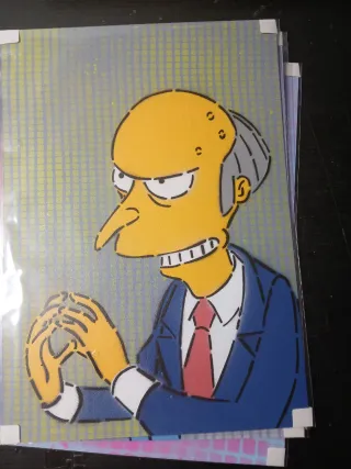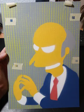 Ilustración del personaje Sr. Burns de Los Simpson. Tamaño A4, realizada a mano on tecnica stencil. No dispongo de stock, fabrico segun me piden, los tonos de lps colores pueden variar.
