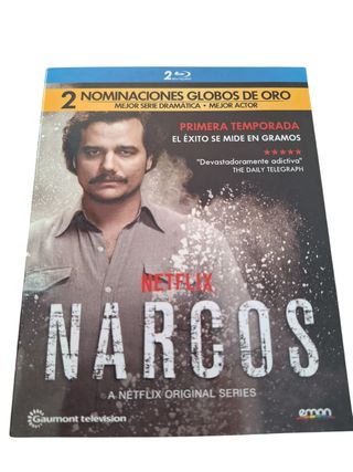 Blu-ray de Narcos, primera temporada, en perfecto estado. - Incluye 2 nominaciones a los Globos de Oro (Mejor Serie Dramática & Mejor Actor). - Edición impecable. - El éxito se mide en gramos. Sinopsis Serie de TV con 2 temporadas. Serie que narra los esfuerzos de Estados Unidos, a través principalmente de la DEA, y de las autoridades y policía de Colombia, para luchar en la década de los 80 contra el narcotraficante Pablo Escobar y el cartel de Medellín, una de las organizaciones criminales más ricas y despiadadas en la historia de la delincuencia moderna.