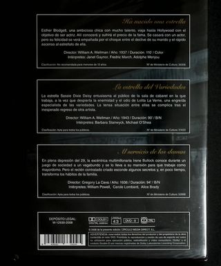 Divas: Ha nacido una estrella, La estrella del variedades, Al servicio de las damas. Sherlock: Sherlock Holmes y el arma secreta, Terror en la noche, Vestida para matar. Cine negro: Perversidad, Con las horas contadas, Detour. Western: La ley de la fuerza, Rabia interior, El forajido. Aventuras: Zulú, Inspector General, Sangre sobre el sol. Familiar: El padre es abuelo, La última vez que ví París, Motín. ********** Precio por película. Cada DVD incluye 3 películas. Compra mínima 2 DVDS.