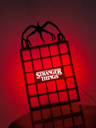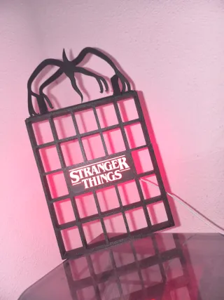 Expositor temático de Stranger Things con iluminación. - Incluie Soportes para las 5 figuras que no se quedan de pie - Diseño inspirado en la serie. - Marco con divisiones. - Logo de Stranger Things iluminado.