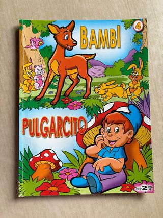 Este libro incluye dos historias, la de bambi y la de pulgarcito. Las páginas están dibujadas por completo y tienen poco texto con letra grande.