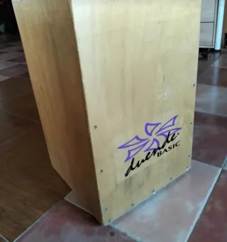 Cajón flamenco de la marca Duende, modelo Basic. Fabricado en madera. - Diseño de madera natural. - Logo de la marca Duende en color púrpura.