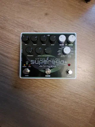 Pedal de efectos Electro-Harmonix Superego+. - Diseñado para crear sonidos de sintetizador. - Incluye controles para Dry, Effect, Attack, Decay, Threshold, Layer y Gliss. - Permite seleccionar entre diferentes modos de efecto como Phase, Flange, Delay, Echo, Detune y Pitch. - Cuenta con controles de Rate y Depth para modular la velocidad y la intensidad. - Incluye interruptores para Moment, Latch y Effect. - Dispone de entrada y salida para conexiones. Usado 3 veces en estudio sin humos. Sin directos. Absolutamente nuevo, como si lo compraras de thomann.