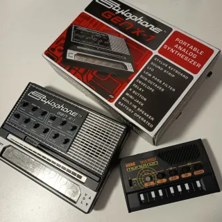 Se vende pack formado por un Stylophone Gen X-1 (actualmente descatalogado, en su caja original) y un Korg Monotron Delay. El cable del stylus del Stylophone se ha encintado porque se estaba empezando a agrietar por el sitio en el que se dobla, pero los dos sintetizadores funcionan perfectamente