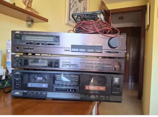 Cadena de música JVC compuesta por amplificador, sintonizador y doble pletina. - Amplificador estéreo integrado JVC AX-2. - Sintonizador FM/MW JVC FX-33. - Doble pletina de casete estéreo JVC TD-W309.