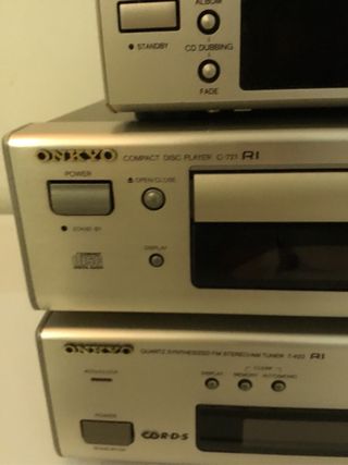 Conjunto de componentes de audio de la marca Onkyo. - Reproductor de CD. - Sintonizador FM. - Reproductor de casetes.