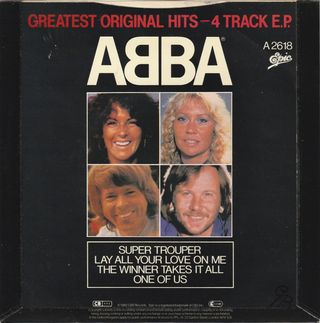 EP de ABBA con grandes éxitos originales. - Título: Greatest Original Hits – 4 Track E.P. EPIC A 2618, 1982. - País de origen: Reino Unido. - Canciones incluidas: Super Trouper, Lay All Your Love on Me, The Winner Takes It All, One of Us.
