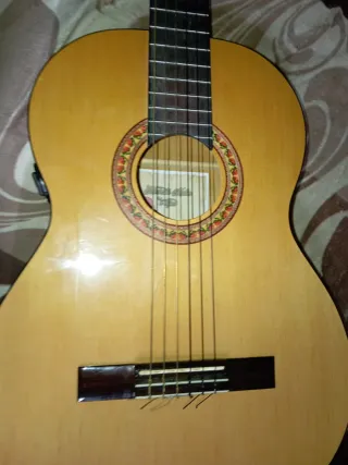 Guitarra española en perfecto estado, lista para ser tocada. - Cuerpo de madera clara. - Diapasón oscuro con trastes. - Clavijero metálico. - Cuerdas de nylon.