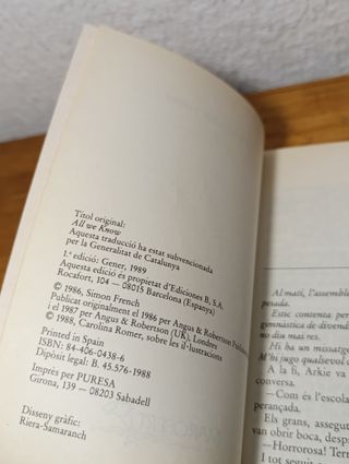 Libro "El primer passeig de l’Spot" del autor Eric Hill, publicado por Fher S.A. Segunda edición del año 1981 basada en el original inglés “Spot’s First Walk”, con ilustraciones sencillas y texto adaptado para primeros lectores. Estéticamente como puede apreciarse en general en buen estado. Formato tapa dura y en catalán. Etiquetas: DeBolsillo, Alfaguara, Anagrama, Planeta, Roca, Salamandra, Seix Barral, Tusquets, Acantilado, Blackie Books, Destino, Siruela, Alianza, Espasa, Grijalbo, HarperCollins, Penguin Random House, Plaza & Janés, Turner, Valdemar, Akal, Cátedra, Martínez Roca, Minotauro, SM, Suma de Letras, Urano, Vicens Vive