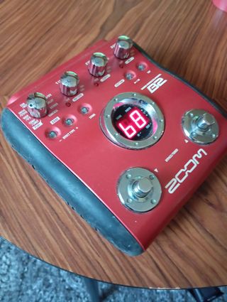 Pedal de efectos para bajo marca Zoom, modelo B2. Es un dispositivo compacto y versátil para bajistas. - Color rojo. - Pantalla digital. - Controles giratorios y pedales. - Logo de la marca Zoom visible.
