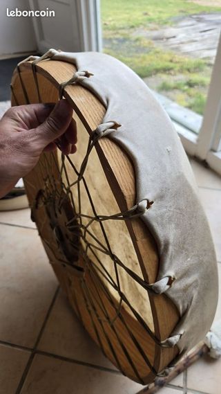 Tambor chamánico artesanal con un diámetro de 45 cm y 8 cm de alto - Elaborado con piel de cabra. - Diseño natural con trenzado tipo Arbol. El constructor es Jordi Ajna. Se lo compré hace unos meses y apenas lo he usado. Tiene un sistema de cámara de bici para tensarlo (así con el tiempo sigue manteniendo su sonido)