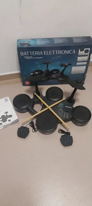 Batería electrónica compacta, ideal para iniciarse en la música. Incluye todos los componentes necesarios para empezar a tocar. - Módulos de batería y platillos. - Pedales de bombo y hi-hat. - Baquetas de madera. - Manual de usuario.