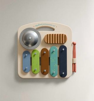 Set de percusión infantil de Zara Home. Incluye varios instrumentos para que los más pequeños se diviertan. - Xilófono con 5 barras de colores. - Platillo. - Tambor de madera. - Baqueta.