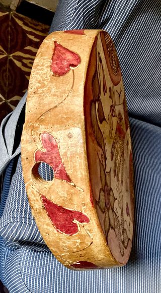 Pandereta de estilo marroquí, con un diseño pintado a mano. - Decoración con motivos tribales y florales. - Bordes decorados con pintura roja y detalles en negro. - Superficie de piel con dibujos de manos y ojos.