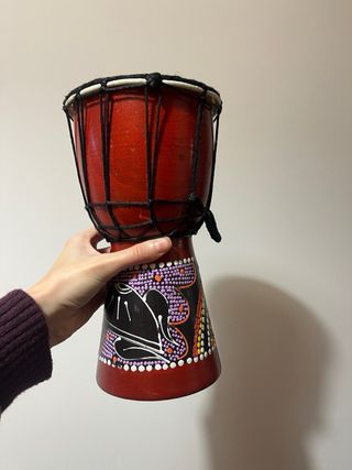 Pequeño tambor djembe de estilo africano. Ideal para decoración o para iniciarse en la percusión. Parece usado pero está igual que cunado lo compre en ghana. - Cuerpo de madera con diseño tallado. - Parche de piel. - Cuerdas de sujeción decorativas.