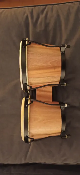 Vendo bongós de madera con aros de metal en buen estado y funcionando perfectamente. Tienen algunas marcas en el cuero por uso infantil, pero el sonido es bueno y se pueden usar sin problema. Ideales para principiantes, niños o para tener en casa y aprender percusión. - Cuerpo de madera con acabado brillante. - Aros de metal cromado. - Base metálica con patas de goma. Negociable Entrega en mano Barcelona