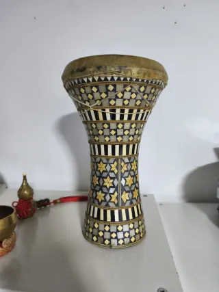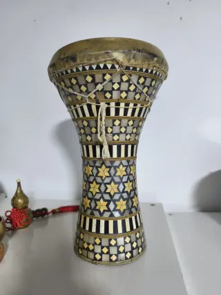 Tambor artesanal de madera con parche de piel. - Diseño tradicional tunecino. - Base de madera torneada con detalles. - Parche de piel tensado con cuerdas.