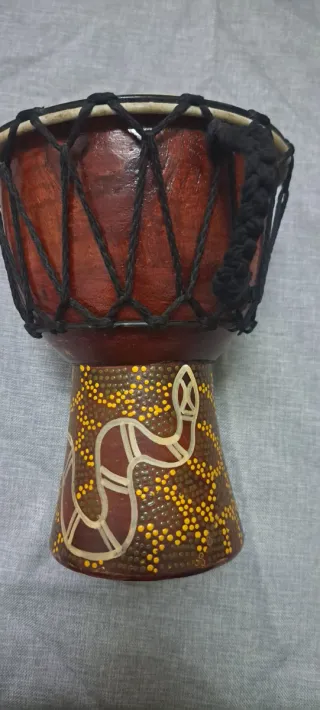 Tambor africano de tipo Darbuka, con un diseño tradicional. - Cuerpo de madera. - Piel tensada en la parte superior.