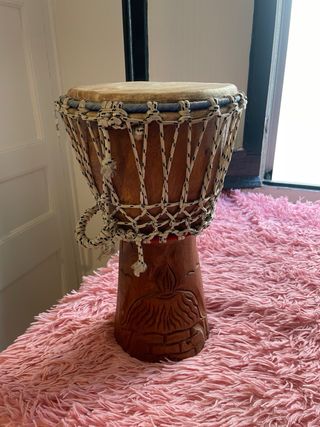 Tambor tipo djembe de madera tallada, en muy buen estado. - Material: Madera. - Decoración tallada. - Incluye red de sujeción. Ideal tanto para tocar como para decoración (pieza muy bonita con dibujo tallado). Medidas aproximadas: tamaño medio. Se entrega tal cual en las fotos.