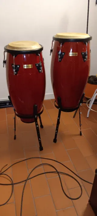 Par de congas de color rojo brillante, listas para hacer música. Incluyen sus soportes. - Cuerpo de conga de color rojo. - Soportes metálicos negros para congas.y también fundas.