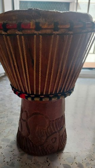 Tambor bongo africano de madera tallada, en buen estado. - Cuerpo de madera con detalles tallados. - Acabado artesanal. - Incluye cuerda para colgar. - Medidas 40 cm de alto por 26 cm de ancho
