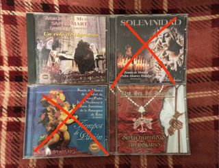 En buen Estado, se pueden hacer packs. Uno ocho euros, más con rebaja. - Agrupación musical Santa Marta Jerez de la Frontera "un velo de lágrimas" - Banda de música Pedro Álvarez Hidalgo "solemnidad" VENDIDO - Banda música Ntro padre Jesús Nazareno y María de la amargura Rota Cadiz "tiempos de pasión" VENDIDO - Banda de cornetas y tambores Ntra señora del Rosario de Cádiz "de tu humildad un Rosario"